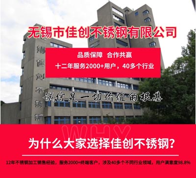 無錫市佳創不銹鋼有限公司,位于長江三角經濟圈中心城市——全國較大的不銹鋼集散地——無錫,依托無錫市場良好的地理環境,交通十分便捷,緊連312國道、滬寧高速,提貨及時方便,并可為客戶提供加工、貨物配送等業務,極大地方便了廣大客戶,銷售網絡已從華東三省遍及全國各地,擁有大批量忠誠的客戶。
