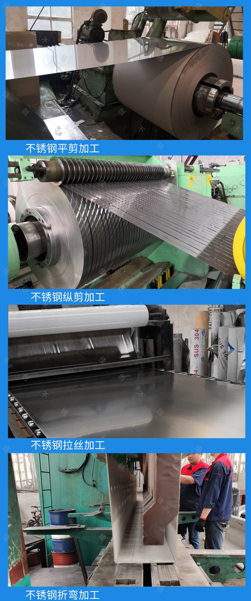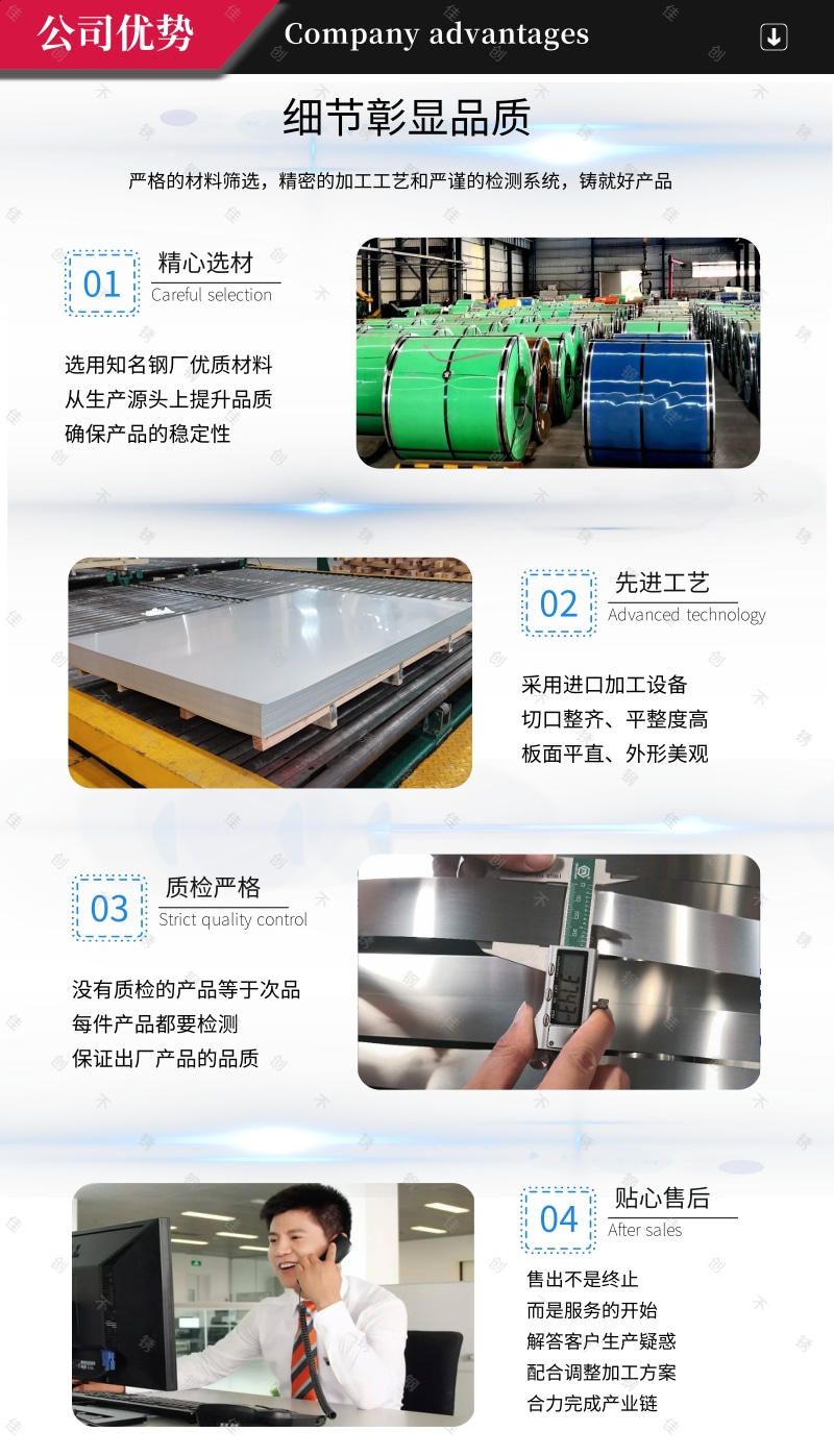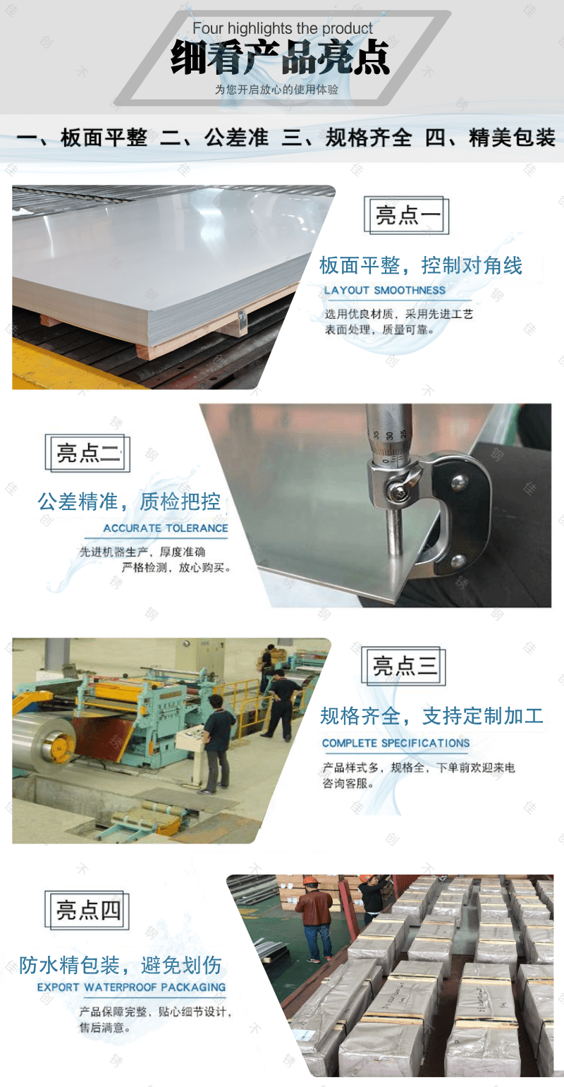 我公司專業從事不銹鋼倉儲、加工、銷售(壓花、剪折、分條、刨槽折邊,拉絲貼膜,切割、沖孔),公司現與山西太鋼、浦項、酒鋼等諸多知名鋼廠建立長期穩定的合作關系。并經銷瑞典、南非、韓國等進口不銹鋼板,公司主要經營品種有304、304H、304L、309S、310S、316L、316H、321、2205、409L、410S、410、410L、430、444、439、201及其它高耐蝕合金鋼 耐高溫不銹鋼 雙相不銹鋼系列 超級不銹鋼系列的材料,同時我公司可代訂太鋼產特殊材質、特殊規格的各類優鋼品種多樣、規格齊全,期貨現貨合作多樣。